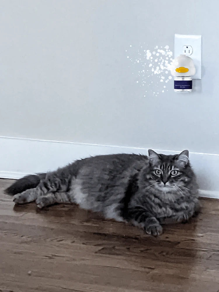 Viviguru™ Diffuser is your hassle-free solution for a calmer, happier cat. It diffuses a natural, calming scent—called pheromones—that only cats can detect. These pheromones are like comforting messages, telling your kitty, "You're safe and loved."